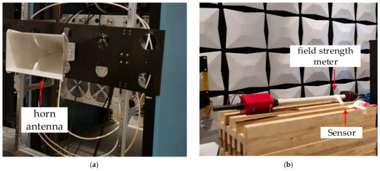 As shown in Figure 9a, the horn antenna was used to radiate the microwave signal. Meanwhile, it can be seen in Figure 9b, the electric field of the radiated microwave signal was detected by the sensor, and simultaneously, the electric field strength was measured by the field strength meter. Consider the distance between the horn antenna with the sensor was d > 2D2/λ, the radiation power density Ps can be expressed as