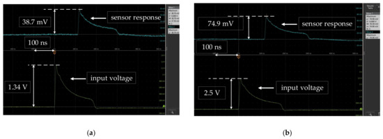 The comparison diagram of the waveform detected by the sensor and the input waveform is shown in Figure 12. The yellow and the blue represent the input voltage waveform and the electric field waveform detected by the sensor, respectively. Figure 12a shows the time-domain response of the sensor under the electric field of 13 kV/m. The rise time and pulse width of the detected waveform were 5 ns and 24.4 ns. Meanwhile, the rise time and pulse width of the input waveform were 5.1 ns and 24.3 ns. The relative errors of the rise time and pulse widths were 2% and 0.4%. Figure 12b is the time-domain response of the sensor under the electric field of 25 kV/m. The rise time and pulse bandwidth of the detected waveform were 6.1 ns and 22.7 ns. The rise time and pulse width of the input waveform were 6.2 ns and 22.8 ns. The relative errors of the rise time and pulse widths were 1.6% and 0.4%. The output waveform of the sensor and the input waveform almost coincided, but there was a delay of about 110 ns. This is mainly caused by the difference in the transmission speed and propagation path length of optical signals in cables and optical fibers.