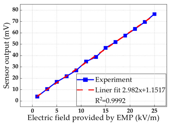 The input/output characteristics of the sensor are shown in Figure 13. It can be seen that the electric field provided by NEMP had a better linear relationship with the output of the sensor in the range of 1 kV/m to 25 kV/m. The linear fitting correlation coefficient was 0.9992. Under a signal to noise ratio (SNR) of not more than 3 dB, the minimum measurable electric field of the sensor was 1.29 kV/m. In addition, the electric field gain K = Ein/E(t) = 6.2 was calculated by ANSYS HFSS. From Equations (3) and (8), Eπ = 336.56 kV/m and Emin = 1.146 kV/m could be obtained. The theoretical minimum measurable electric field was less than the actual measurement. It is considered to be caused by the incomplete consideration of noise source. The thermal noise, the shot noise, the dark noise, and the relative intensity noise were considered as all noise sources in the theoretical calculation, while the sensing system also included 1/f noise, generation recombination (g-r) noise, and temperature noise, etc., due to the maximum electric field 25 kV/m which could be provided by the laboratory. The maximum measurable electric field Emax = 100.97 kV/m (Emax = 0.3Eπ) of the sensor was calculated. The measurable linear range of the sensor was 20 dB.