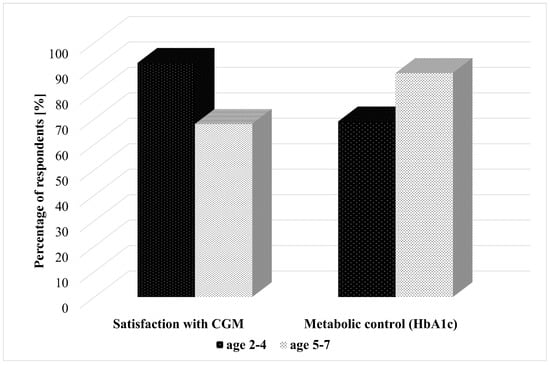 Satisfaction with CGM was reported by 68% of caregivers of 5–7 year-olds and the majority—92% of 2–4 year-olds. The HbA1c < 7% in the youngest children—2–4-year-olds, was 69%, and in 5–7 years—88% (Figure 1).