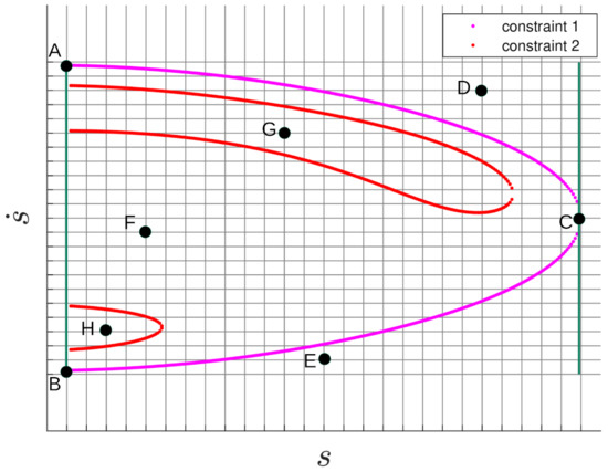 - Find , which is the coordinate at the right hand extreme of constraint 1 (Equation (3)), shown as point C in Figure 1. This coordinate can be found by differentiating constraint 1 with respect to and setting . Note that s is a function of , i.e., . The solution can be determined by realizing that , then substituting for into constraint 1 (Equation (3)) and solving the resulting 6-th degree polynomial to obtain .