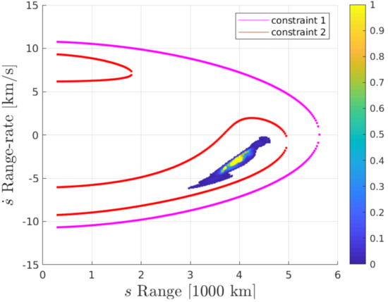 Figure 2 shows curves corresponding to constraint 1 (magenta) and constraint 2 (red) for the SO based on simulated measurements corresponding to satnum 337 from the TLE. It also shows the posterior SO distribution, which is modeled with particles with weights represented by the color map in the figure. The particle distribution state variables and weights are determined as follows:
