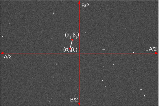 Image taken from the sidereal tracking of NORAD satellite 25,853, from the Mitre Corporation. Horizontal/vertical arrowed red lines indicate angular axes, red dots indicate the satellite coordinate at and at .