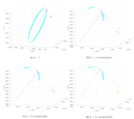 where a and e represent the semi-major axis length and eccentricity, respectively, of a hypothesized SO orbit. The Earth gravitational constant [] and , , and to are given in Appendix A. Note that these constraints are functions with variables s and , and form a 2D nonlinear system of equations. The solutions of the equations are given in Appendix A with their derivations given in [4,10,22].
