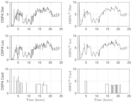 - Beard, M.; Vo, B.T.; Vo, B.N. OSPA (2): Using the OSPA metric to evaluate multi-target tracking performance. In Proceedings of the 2017 International Conference on Control, Automation and Information Sciences (ICCAIS), Chiang Mai, Thailand, 31 October–1 November 2017; pp. 86–91. [Google Scholar]