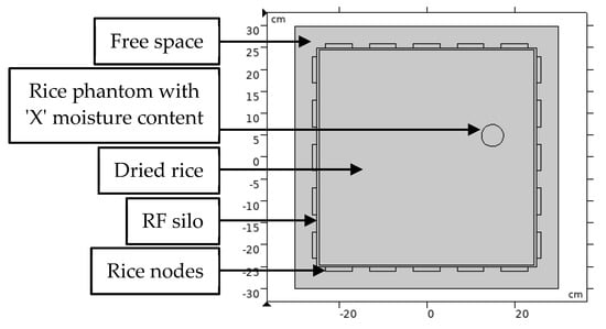 It is essential to study the behaviour of RF energy in a rice medium to control for the confounding variables and ensure the repeatability of obtaining RF attenuation for each scenario in the study. Figure 2 demonstrates the configuration setup of the FEM simulation. The RF sensor network comprising 20 nodes was configured on a 2D square silo. Each node is equally arrayed 40 mm apart, along the perimeter of a 0.5 m 0.5 m modelled silo with an operating frequency of 2.4 GHz. The 2.4 GHz frequency was chosen to utilize the low-cost and standard ISM band of the wireless sensor network (WSN). The nodes were arranged in such a way to receive the scattered electric fields in multiple directions. The number of pixels that reflect the image’s resolution was set to 300 300 pixels. The following subsections comprehensively explain the design and selection of the simulation parameters.