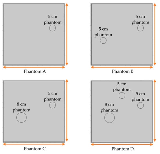 As mentioned above, the dimensions of the silo used in this simulation study were 0.5 0.5 m. These dimensions were specifically chosen to investigate the capability of the RTI technique to image the moisture distribution inside the silo. The dielectric properties of the silo material were chosen from the predefined FEM input model. Polymethyl methacrylate (PMMA) with relative permittivity and conductivity of 2.5 and 0.0068 S/m, respectively, was selected due to its popularity in various applications []. In addition, the same material will be used for our future experimental study.