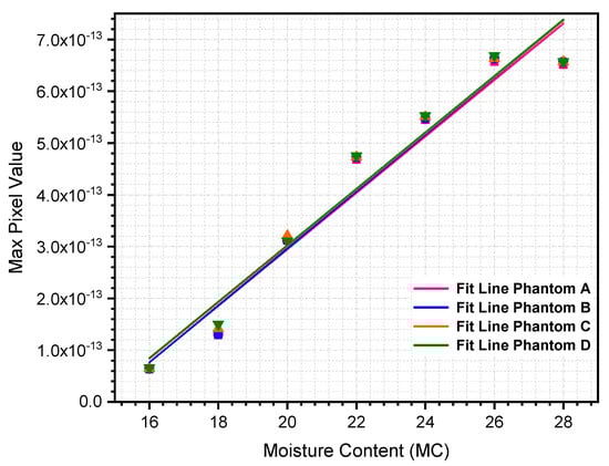 Before the measurement and image reconstruction procedures, the reference medium was represented by dried rice at its respective dielectric properties, and the reference measurement was conducted. Then, a different permittivity of rice phantom at ‘X’ MC was introduced into the reference medium. The reconstruction algorithm was used to analyze the difference between the pixels’ density data for the scenario with and without phantoms, and to calculate a qualitative approximation of the permittivity distribution. Therefore, the maximum (max) weighting pixel of the reconstructed images should indicate its corresponding ‘X’ MC.