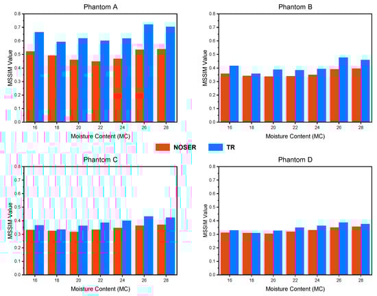 As presented in Figure 7, we can observe that the Tikhonov Regularization algorithm recorded the highest MSSIM Index for all four moisture distribution profiles. The highest and lowest MSSIM Indexes scored by the Tikhonov Regularization algorithm were 0.7211 for Phantom A at MC of 26%, and 0.3092 for Phantom D at MC of 18%, respectively. For the MSSIM Index scored by the NOSER algorithm, the highest and lowest indexes were 0.5389 for Phantom A at MC of 28%, and 0.3040 for Phantom D at MC of 20%, respectively. Therefore, it can be deduced that the Tikhonov Regularization technique is better in reconstructing the moisture distribution in the rice silo.