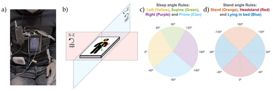 - The sleep position angle was used to determine the four sleep positions (supine, prone, left and right). It was calculated by (1), where , with and being the values of the X and Z axis of the triaxial accelerometry at each specific timestamp; , which is a static reference aligned with the left sleep position; and , to be able to differentiate supine and prone positions. This angle explains the orientation of the accelerometry in the X-Z plane as shown in Figure 1b.