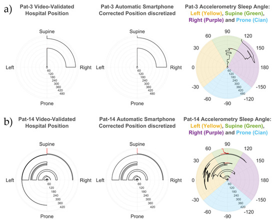 Two examples of the sleep angle calculated from the smartphone are shown in the polar plots for patients 3 and 14 in Figure 2 and overlaid onto the video-validated hospital position for patient 14 in Figure 3. The smartphone discretized angle from patient 3 (Figure 2a) shows perfect alignment with the manually video-validated position from the hospital PSG. Moreover, the sleep angle showed multiple subtle position changes which were not observable from the discrete validated hospital position data. Similar alignment is observed in patient 14 (Figure 2b), a complex case with multiple position shifts that were all properly detected.