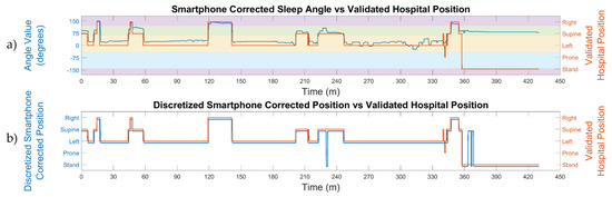 Figure 3a plots the sleep angle and the hospital video-validated position, with close agreement observed between the two. However, the changes detected by the smartphone accelerometry are of greater resolution than those recorded as the video-validated position. The agreement between the automatic discretized smartphone corrected position and the hospital video-validated position can be seen in Figure 3b. Again, the smartphone detected some small stand and supine positions which were not defined in the validated hospital position. Nevertheless, most of the sleep positions were well identified by both devices.