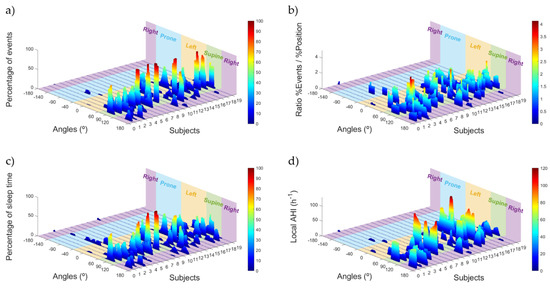 Percentage of OSA events (a), the percentage of sleep position time (c), the ratio between the percentage of OSA events and the percentage of sleep position time (b) and the local AHI (d) for each sleep position angle and for each of the subjects of the database. The four discrete sleep position areas have been colored and are shown in the 3D plot.