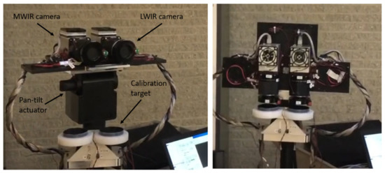 The two cameras are mounted on pan-tilt actuators that can be used to scan different viewing angles, and to provide occasional downward-looking views of the blackbody calibration targets. These targets serve as a known temperature reference that enable converting detector signal intensity to scene radiance and apparent temperature. The targets consist of aluminum plates covered with high-emissivity paint (black velvet). The target temperatures are measured since these temperature values are required to apply radiometric correction, as described in the next sub-section. The targets are thermally passive, and therefore their temperature can vary depending on the ambient temperature.