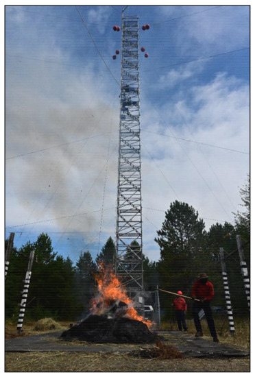 A series of experimental burns was conducted for this study at the Canadian Forest Service’s Rose Experimental Burn Station [19,22] over three days in September of 2019. The Bomberos system was mounted ~21.6 m up a scaffold tower 4.8 m east of the burn platform. A commercial MWIR camera was mounted on the same level of the tower to serve as reference imagery for comparison. The view zenith angle for the imagers was ~21 degrees, as shown in Figure 2.
