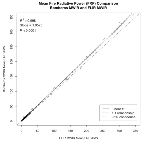 The Bomberos MWIR and FLIR MWIR intercomparison for FRP was carried out by comparing the mean FRP for each sequence. The sum of FRP per frame was taken for both the Bomberos MWIR and FLIR MWIR data, and then the mean was calculated for each one-second sequence. The field of view for the Bomberos and FLIR cameras were not the same, so in instances where there were multiple fires on the burn pad, each fire was isolated in both the Bomberos and FLIR images so that the FRP comparison would only be for a single fire. In cases where there was only one fire on the burn pad, the entire field of view for each camera was compared in the FRP comparison. The mean FRP values for each sequence of the Bomberos MWIR and FLIR MWR data were then plotted against each other and compared using linear regression with the intercept constrained at 0. In this analysis, the slope from the linear regression estimated the deviance of the FRP values from the line of perfect agreement. A separate t-test was also conducted to determine if the slope of the relationship between the FLIR MWIR and Bomberos MWIR FRP data was significantly different from the line of perfect agreement. There were 67 one-second fire sequences, resulting in one mean FRP estimation each, which were compared in this analysis.