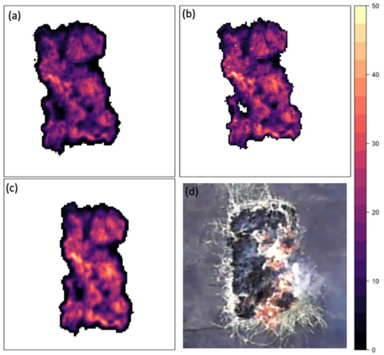 Images of a 1.5 × 3 m fire on 16 September 2019. (a) MWIR Bomberos image of FRP per pixel in Watts. The total FRP for the fire in the frame is 64,236.2 W (64.3 kW); (b) LWIR Bomberos image of FRP per pixel in Watts. The total FRP for the fire in the frame is 72,651.0 W (72.7 kW); (c) MWIR FLIR image of FRP per pixel in Watts. The total FRP for the fire in the frame is 63,642.9 W (63.6 kW); (d) Visual imagery of the fire from a camera fixed to a tower 21.6 metres above the fire.