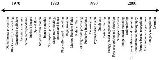 As the CV topics evolved over the time (see Figure 1), the complexity of the required architectures did too. Pipelines can include image acquisition from image sensors; preprocessing to enhance the image such as reducing noise; selection of region of interest such as background subtraction; feature extraction that would reveal lines, edges, shapes, and textures; high-level processing relevant to the application; and finally, decision-making such as classifying an object as being a car [1,18,19].