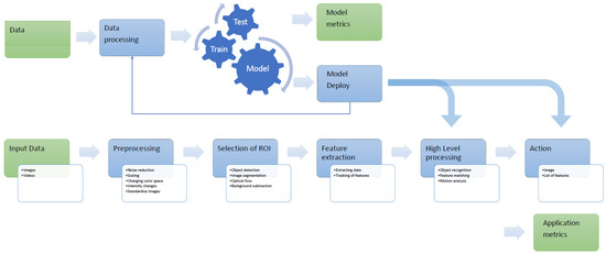 Considering the long-term evolution of CV systems and increasing number of applications, multiple implementation solutions were used to obtain the desired pipelines. Optimization of the CV system may vary by system and considers multiple parameters in doing so. A low-power such system for mobile phones may have a limited GPU and CPU SIMD instruction set which will cause a thinning of the pipeline. However, in any case, the modern CV pipeline is a blended system that include AI elements, such as ML or DL, and classical image processing activities, as we can see in Figure 3.