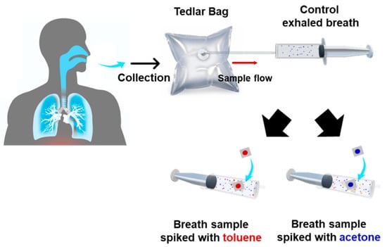 Schematic diagram of toluene- and acetone-spiked breath sampling. Human lung image captured form https://www.axetris.com, 12 March 2021 website.
