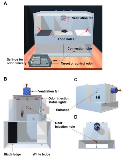 Schematic diagram of the multi-odor discrimination device based on the combined 2-Choice/No-Go paradigm. (A) 3D-front view, (B) 3D-top view, (C) Lateral-view of the backward and (D) Rear-view of the apparatus.