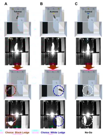 Photograph of the multi-odor discrimination device. (A) Choice of black ledge in response to toluene. (B) Choice of white ledge in response to acetone. (C) No-Go in response to control.