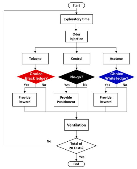 In general, animals instinctively detect situations that threaten them. Rodents, for example, use their strong sense of olfaction to recognize and avoid predators they have never seen before []. Some animals (i.e., dogs, rats, etc.) have superior olfactory discrimination abilities compared to humans. Such animals’ innate ability for odor detection and associative learning is the basis for animal nose biosensors [,]. Although understanding for odor recognition has not yet been fully clarified at the molecular level, animals conditioned with odor stimuli can quickly and accurately recognize VOCs (volatile organic compounds) and exhibit alerting behaviors as specific signaling behaviors []. Animal nose sensors, which utilize animal’s olfactory ability to detect specific odors, are gaining increasing interest in the fields of forensics and homeland security due to their cost efficiency and excellent detection performance [,], and has been mainly applied to drug detection [,] and mine/explosive detection [,]. In recent years, the animal nose sensors are expanding their applications to medical fields such as cancer detection [,] and blood sugar detection [,] with advantages of non-invasive detection and early detection of disease. In particular, the use of detection animals in biomedical applications, which is directly connected to human life and health, has an important meaning to complement the problems of existing device-based diagnostic methods. Rats or mice have several advantages as detection animals. Compared to canine, they eat small amounts of food, and are so small that a large number of rats can be handled by the experimenter. Therefore, maintenance is relatively economical [,]. Also, they are trained on small indoor apparatus. Therefore, reinforcement and punishment are given immediately after the animal’s behavior occurs, thus avoiding learning inefficiency due to the delay of reward timing []. In addition, many groups of detection rats or mice can be simultaneously trained by simply increasing the number of small and inexpensive training apparatus. Therefore, a sufficient amount of data can be acquired, leading to higher reliability by means of statistical analysis []. In this regard, rodents are the best candidates.
