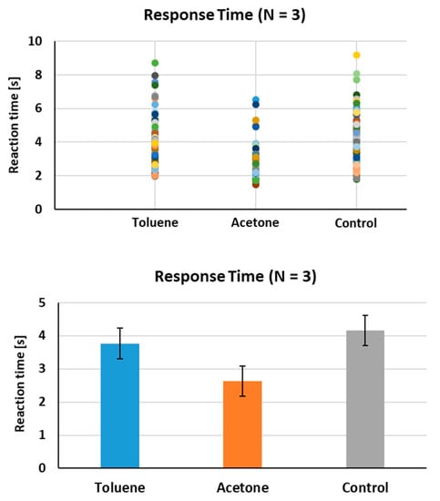 Each of the tests is completed every 50–60 s on average in rats under our experimental settings. The set is configured in 20 tests. So, the time required for the acquired set is about 17–20 min. The test time performed consists of odor presentation and response time, reward or punishment delivery time and ventilation time. The most important factor in determining the deviation of test time is response time. The response time was defined as the time taken for animals to jump onto the ledge after target odor presentation or to stop moving after control odor presentation. The purpose of this study is to discriminate different odor components from animal sniffing. There are studies showing that the detection performance of a living animal-based biosensor has a correlation with the response time [,,]. Therefore, we wished to verify whether the two target odor components display a difference in the response time, or whether the response time of the target odor was different compared to the control breath samples. As shown in Figure 6, the average response time of the three tested rats to toluene was about 3.76 s, which was longer than that to acetone (about 2.63 s). When the sensitivity was individually expressed as toluene and acetone, toluene and acetone sensitivities were about 87% and 86%, respectively. This result indicates only a weak or no correlation between sensitivity and response time in our experimental settings. The difference in response time between the two odors can rely on the odor preference between animals, the chemical structure of the odor molecules, the type of reinforcement, etc. A further study is necessary for the causes of this phenomenon. In addition, it was observed that the response time for both target odors was longer than that of the control breath (about 4.16 s, Figure 6). In general, when the performance accuracy is at chance levels (i.e., in initial trials of a new discrimination task or in acquiring a particularly difficult task), the response times for both target and control odors are essentially the same. In this study, the animals had tendency to spend more time in recognizing the control odor, while less time in identifying the target odors. This result is in a good agreement with previously reported results on the relationship between response time and accuracy []. This phenomenon can provide an indirect sensitivity index of odor discrimination by animal sniffing, as the accuracy increases, the response time to the target odors decreases.