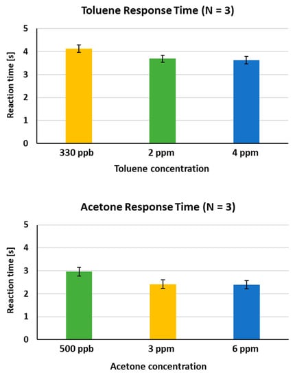 In case of analysis of information on human health like disease diagnosis by specific odors, the determination of the amount of disease markers is very important in terms of early diagnosis and risk prediction of disease. In animal nose sensors, changes in behavior in response to odors are monitored as detection signals. So, it is impossible or very difficult to measure the animal’s behavioral changes quantitatively. For the reason, we wished to examine whether the behavioral signals exhibited by the detection rats could provide a quantitative measurement of multi-odor discrimination. For this, during the course of tests, the time taken for rats to jump onto the ledge after odor presentation was measured. As shown in Figure 7, the average response time for the three tested animals was observed to be about 4.13 s, 3.69 s and 3.63 s in response to toluene at increasing concentrations (330 ppb, 2 ppm and 4 ppm), and about 2.96 s, 2.41 s and 2.39 s in response to acetone at increasing concentrations (500 ppb, 3 ppm and 6 ppm), respectively. This result shows a dependence of behavior response time on odor concentrations under given concentration conditions, indicating that the trained rats could potentially perform quantitative measurement. The exhaled toluene level in lung cancer patients is known to be approximately 80–100 ppb [], while the acetone concentration in the exhaled breath of diabetes patients is typically above 1.8 ppm []. The level obtained from this multi-odor discrimination study is approximately 3.3-fold higher and 3.6-fold lower than that observed in the breath of early lung cancer and diabetes patients, respectively. Thus, the sniffer rats’ sensitivity to toluene may need to be improved for clinical significance.