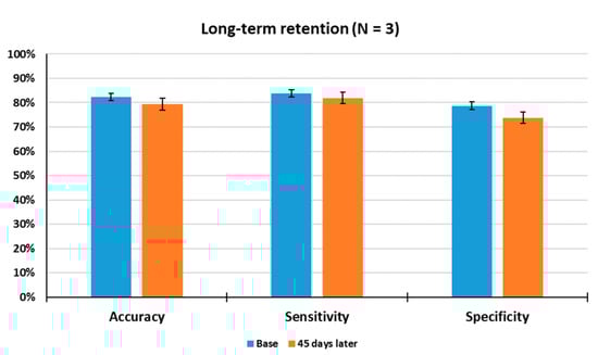 As shown in Figure 8, the average accuracy, sensitivity and specificity were observed to be 80%, 82% and 76% through a total of 140 tests, respectively, when tested after a 45-day rest period. The results denote that long-term stability of learned multi-odor discrimination appears to be unimpaired in all of the tested rats. In particular, the performance of all rats measured under a given condition was within the range of ±10% deviation, suggesting that the trained rats well maintained the learned multi-odor information over a long period of time.