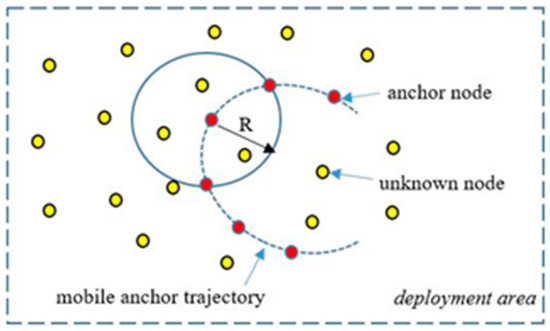 Due to the disadvantages mentioned above of GPS for localization in WSNs, approaches generally using as few GPS devices as possible have been studied in the literature. Therefore, it would be more logical to periodically broadcast location information with one or several mobile anchors (MA) equipped with GPS units and position UNNs as shown in Figure 1. On the other hand, unknown static nodes do not move once they are deployed for detection tasks [7].