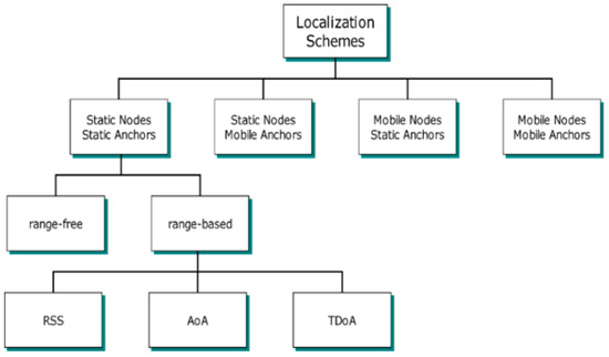 It has become necessary to reclassify the localization schemes, divided into two classes as range-based and range-free according to the distance measurement method, considering the mobility of known or unknown nodes. Therefore, if this classification is expanded to consider mobility, four main classes are obtained, as shown in Figure 2 [11].