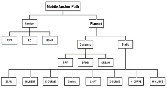 In this approach, a node with locational information called MA broadcasts this information periodically, allowing the UNNs locations to be found according to some localization techniques (e.g., RSSI, TOA, or TDOA). The total cost in the network will be reduced by using a single anchor node [18]. The classification of the paths in the approaches finding UNNs with the MA movement and detailed information about these paths are given in the following subsection.