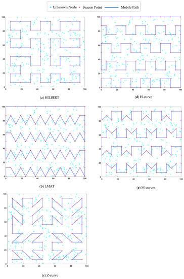 Kannadasan et al. [10] devised a different path planning scheme that follows MA’s trajectory “M” shape. Therefore, they called the proposed scheme “M-curves”. In this study, two successive rows are patterned with the letters M and W. There is a dm-long space between the letters M or W in each row. A dm/2 distance difference is created between two rows. Thus, a triangle-like communication form was obtained, similar to the H-curve, and a solution was found to the collinearity problem. The authors used the “Centroid Method” as the localization estimation method and aimed to increase the performance of the proposed method by adding the “Dolphin Swarm Algorithm (DSA)”. The M-curves path planning model is shown in Figure 4e.