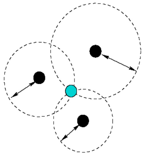 The trilateration method is a geometric technique that uses distances between three ANs and one node of the unknown location to determine a UNN’s location. A UNN can be localized when at least three reference points associated with it in two-dimensional space are known. The location of the UNN can be estimated by calculating the intersections of three circles. This situation is shown in Figure 6. In this way, three dark-colored nodes represent the ANs whose locations are known, and the light-colored node represents the target node whose location information is trying to be obtained by using the positions of the ANs [33].