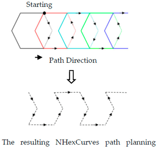 In this study’s path planning model, the MA starting from (0, 3dx/2) point follows the dx length horizontal segments of the pattern and the length cross line segments of the pattern with straight lines, as shown in Figure 8. The MA that completes a row movement moves up to 2dx higher on the y-axis and starts moving in the opposite direction of its previous movement. The MA begins drawing the NHexCurves pattern designed in this row after a straight line of dx/2. This process prevents two consecutive lines from intersecting, ensuring an isosceles triangle between the two rows and thus eliminating the problem of collinearity. The MA, which completes its pattern at the end of the second row, moves up to dx this time and continues the same process until it covers the entire ROI. If we look closely, the second row is completed by continuing the logic of creating the same triangle form of communication.
