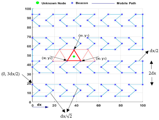 Han et al. [29] presented a path planning scheme called LMAT based on trilateration for MAs. In this scheme, the distance between the two locations in which the MA broadcasts location information is defined as the resolution. MA continues its trajectory by forming symmetrical equilateral triangles and broadcasts location information to UNNs at each vertex of these equilateral triangles. This process ensures that the collinearity problem is solved successfully. High localization accuracy and high localization ratio are achieved with LMAT. However, the length of the path traveled by the MA is long. The LMAT path planning model is shown in Figure 4b.