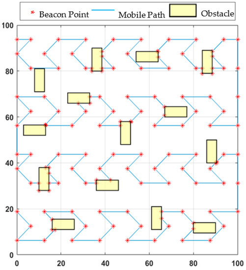 There may be obstacles in the network area in a realistic environment, blocking the MA’s path. In the obstacle-resistant trajectory developed in [34] and used in [9], MA detours the obstacle and issues a detour flag at the obstacle’s corner points. A UNN uses these flag signals to determine its location. When the MA moves away from the obstacle, it returns to the original trajectory and starts broadcasting standard beacon messages. Since the path planning models discussed in this study are deterministic, the movement pattern and beacon positions for message broadcast are already known. Therefore, the MA can cross the edge of the obstacle and continue the path planning pattern where it left off.