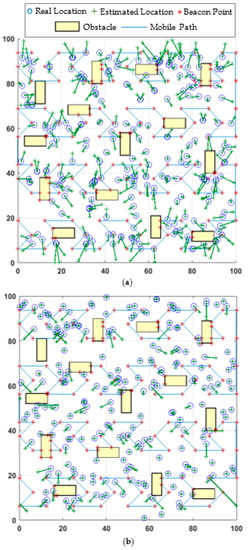 The proposed mobile path’s obstacle-handling trajectory and estimated locations of the nodes distribution in (a) WCL, and (b) APT.