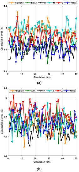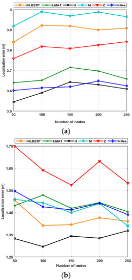 Scalability means localization performance is independent of the number of UNNs in the ROI. In this paper, the number of UNNs has been changed from 50 to 250 and uses the resolution of 1 and a std of noise σ = 7 to test the path planning models’ scalability. Figure 17a shows the change of the path planning models’ average error performance according to different node volume for the WCL method. First of all, it can be seen from Figure 17a that the H-curve and the proposed NHexCurves models show the best error performance of all the node numbers. Additionally, it can be said that the localization error values of NHexCurves are almost unchanged and remain constant against the changing number of nodes. When the scalability performance of the models for WCL is evaluated, it is observed that the error performance of all models does not change much with the changing volume in nodes. This can be explained by the fact that the localization method used is WCL and the statistical distribution of UNNs deployed on the network is uniform. In terms of localization error performance, it can be said that all mobile path planning models are largely scalable for the WCL method. If the same evaluation is applied to the APT localization method, it cannot be said that the error performance of all models varies significantly with the changing number of nodes again. The error values are lower due to the nature of the APT method, and again, the H-curve showed the best error performance in all node count cases. Although the models’ error values are similar, the Z-curve is set apart from the other models because it produces a slightly higher error value. The error value of the proposed model NHexCurves changed much less than other models with the changing volume of nodes. Therefore, it can be said that NHexCurves is the best model in terms of scalability performance compared to other models for both WCL and APT localization methods.