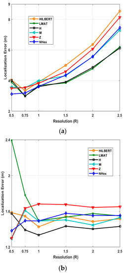 As can be seen from Figure 12a, the proposed NHexCurves model showed good error performance at low-resolution values for the WCL method. The proposed model stands out compared to other models, especially with a value of R = 0.5. As is known, WCL takes the weighted average of the beacons in the coverage area to determine the locations of UNNs. If paying attention, there are many turns in the proposed model. Beacons are also published on these turns. This increases the probability of finding more beacons than the uniformly distributed ROI for the WCL method, especially when the resolution decreases. Therefore, the performance of the proposed model can be higher at low resolutions. After R = 1, the H-curve and LMAT models showed the best error performance. NHexCurves comes after these models. The performance of the H-curve and LMAT models are similar. In general, error values are obtained slightly higher due to the WCL method. The worst result is again achieved with the HILBERT model. Figure 12b shows the results of the same scenario for the APT method. Here the error values are generally similar, and far fewer errors are obtained than in the WCL. In the proposed model, the distance between the beacons is less than the other models. This is because NHexCurves contains more triangles in different sizes than other models. For this reason, NHexCurves show high performance at low resolutions. Additionally, interesting results have been encountered in this scenario. It has been observed that the LMAT model, which shows stable results after R = 1, gives higher localization error at resolution values lower than this resolution value compared to other models. Although different step intervals are used in other models, if we pay attention, the step range of LMAT is fixed and 12.5 m, and LMAT uses equilateral triangles in its path model. Therefore, in APT, the localization performance of LMAT is low for resolutions less than R = 1. The Z-curve model, which generally provides higher localization error results than other models, gave the best error result with M-curves at R = 0.5. The performance of the proposed NHexCurves model is also very close to these models. However, it can be said that the H-curve gives the best error performance in the overall performance evaluation in this scenario.