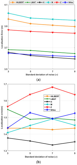 Secondly, in Figure 13, the same parameters are repeated with different std of noise (σ) values for the fixed resolution. Figure 13a shows the average localization error for the path planning models with a different σ when the WCL algorithm is applied, and Figure 13b illustrates the same as when APT is used. In the first algorithm, the model with the smallest localization error for all σ values is H-curve. Additionally, the error performance of the proposed model obtained is very close to H-curve in this scenario. For these two models, the error values σ = 3 and σ = 5 are almost equal. Compared to the other models, it can be said that the error performance of the proposed model changes less with changes in σ. The reason that the localization error does not change much with the σ is characteristic of the WCL method that takes the weighted average of the beacon locations. As can be seen from Figure 13b, H-curve, M-curves, and HILBERT path planning models provided a slight superiority compared to others. If you pay attention, the results obtained for all models are very close to each other, and the APT method again provided more precise accuracy than WCL.