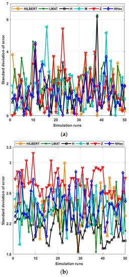 Figure 14a shows the std of the localization error for each path planning model for WCL and Figure 14b for APT. R = 1 and σ = 7 for each simulation. Since the std of localization error performance of the errors according to the number of simulation runs was close, as in Figure 11, statistical characterization is again preferred to facilitate performance interpretation of the considered path planning models. Table 4 and Table 5 show the statistical characterization of different static path planning models for WCL and APT, respectively. As can be seen from Table 4, the std of error performance of the H-curve and NHexCurves path planning models for the WCL method is better than the other models, and the performances of these models are similar. According to this performance criterion, the LMAT model’s performance is relatively poor compared to the others. When the same evaluation is performed for the APT localization technique, it can be said that the H-curve model stands out compared to other models. The Z-curve model has been the worst-performing method in this scenario.