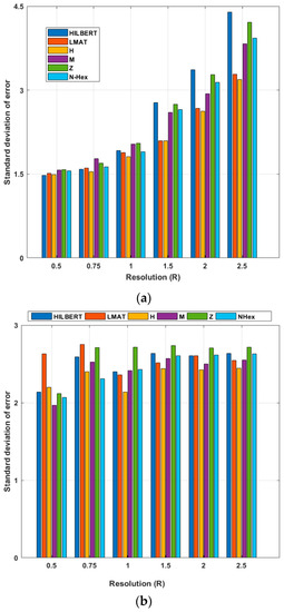 The average of the 50 simulations is then calculated using different R values, as shown in Figure 15. In Figure 15, σ = 7 and R varies between 0.5 and 2.5. These figures show the std of the localization error for different resolution values. When the performances of the models for the WCL method are evaluated, the error performances of the models at R = 1 and smaller resolution values are generally close to their average. However, at larger resolutions, the error performance of the models is slightly different from the average. As the resolution increases, the std of the error value of the models increases according to the previous resolution. The std of error performance of the proposed path planning model is higher at lower resolutions. For the WCL method, the LMAT and H-curve models show the best std of the error performance. According to the same evaluation criteria, HILBERT again shows the worst result. When the same error performance evaluation of the models for the APT localization method is made, it can be said that the proposed NHexCurves model shows the best performance at resolution values less than R = 1. It should be noted here that the LMAT model, which is one of the models that gives the results of the std of the best error for the WCL method, gives poor performance, especially at low resolutions (R < 1) in the APT method. As shown in Figure 12b, the LMAT show high error results for R < 1. After R = 1, it can be said that the H-curve is the best performing model and the Z-curve model is the worst performing model, although there are no significant differences between the performance of the models in general.
