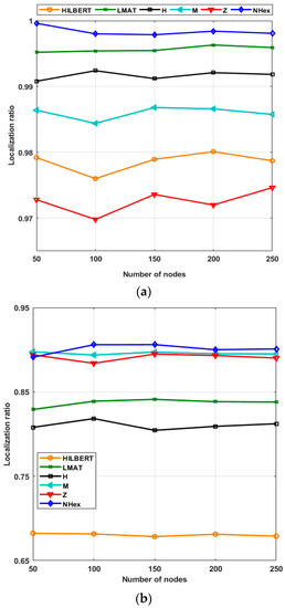Figure 18a shows the localization ratio performances of the path planning schemes for the WCL according to the varying number of nodes. As seen from the figure, each path planning model has localized almost all of its nodes in this resolution value. Moreover, the localization ratios of each method have not changed with the changing number of nodes. The same determination can be made for the APT method; the same scenario for APT appears in Figure 18b. Using this method, NHexCurves has the best localization ratio for all node numbers among path planning models. This ratio is approximately 90% and has not changed much according to the number of nodes. M-curves and Z-curve models produced results very close to NHexCurves. When considering the changing volume of nodes, the localization ratio performance of these three models is better than the other models. However, according to the changing number of nodes, the HILBERT model’s localization ratio performance was noticeably worse than the other models, which is an expected result as explained in the previous chapters.