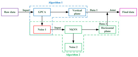 The general idea of the filtering method is presented. Algorithm 1 is used to process the initial data, and the wall point cloud and noise 1 are obtained. Noise 1 is composed of the ground point cloud and noise. Then, Algorithm 2 is used to process noise 1, and the ground point cloud and noise are separated. Finally, the wall and the ground are joined together.