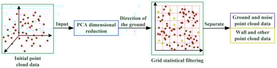 When outdoor environmental modeling [39] is carried out with lidar, point cloud noise is generated at the stage of obtaining PCD. The aforementioned methods can effectively remove discrete outlier points which are treated as a noisy target. However, by using these methods, it is difficult to remove high-density noises, such as indoor environmental noises, which are relatively dense. This paper proposes a new filter scheme based on the distribution characteristics of indoor and outdoor point clouds for effectively handling high-density noise. The 3D point cloud is preprocessed by principal component analysis (PCA) [40] method therefore the reduced 2-dimensional point cloud toward the ground, consequently, the feature points of the wall are separated by a carefully designed grid threshold, which depends on the statistical difference between the pure ground points and the wall points projecting on the mesh grid of ground. This process is called grid principal component analysis (GPCA). Then, KD-tree [41] for the filtered point cloud is established to estimate normal vector features, which then facilitate the further plane segmentation. After the plane is segmented based on the angles between the normal vectors, the ground model is further optimized by the K nearest neighbor (KNN) method. The main idea of the proposed filter method is shown in Figure 1. Experimental comparisons with other traditional filters show that the proposed method is significantly advantageous over than other traditional methods, including statistical outlier removal (SOR) filter [42], voxel grid statistical outlier removal (VGSOR), radius outlier removal (ROR) filter [43], Gaussian filter [44], and difference of normals (DON) filter [45], for removing indoor point cloud noise.