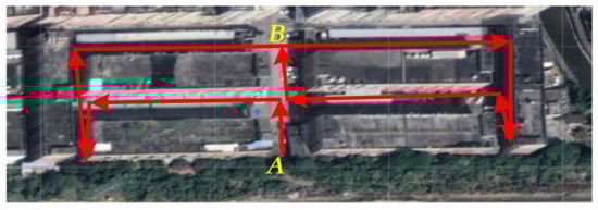 During measurement, we moved along the red line to collect the data. In order to ensure the integrity of the data, we planned the route so that everything could be scanned by the lidar. We took the equipment in the middle of the road and moved about five meters away from the wall. Then, we carried backpacks and moved on foot along the path. The whole process lasted about three minutes. Finally, we got the complete data. The edge of the data is the surface of the building. The point clouds outside the edges of the figure, and inside the two rectangular edges in the middle are indoor debris measured by lidar through the glass of the building. The debris is the main PCD noise. Vehicles, trees, and other objects on the ground can be considered sub-essential cloud noise depending on the situation. Next, we took this data as an example to verify the algorithm.