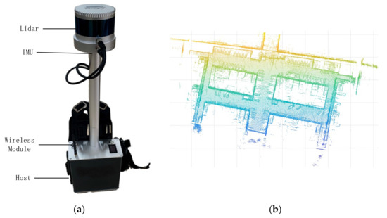 Backpack system and collected point cloud data (PCD): (a) the equipment we used to measure the data consists of a lidar, an inertial measurement unit (IMU), a wireless module, and a host. (b) After collection and scan registration, we obtained the three-dimensional data.