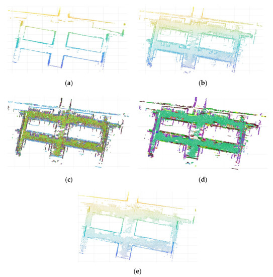 Before processing the noise, a SOR filter was used for preprocessing to facilitate segmentation and to achieve better results. The processed data are shown in Figure 8a,b. Figure 8a represents the wall point cloud after using GPCA, and Figure 8b represents point clouds other than the wall. Then, the initial segmentation points and the remaining points were randomly selected to calculate the included angle of the normal vector, and those less than the threshold value were classified into one category. The same was performed for the remaining points until all of the points were sorted. This is an unsupervised segmentation, and the number of categories obtained depends on the size of the angle between the normal vector set. In the end, we divided the noise into nine categories, and the results are shown in Figure 8c. It can be seen that the classification effect is not ideal, that the ground is roughly divided into two categories, and that the distribution of categories is disorderly. However, it can be found from the figure that the points occupying most of the ground are a class; therefore, the K nearest neighbor constraint was considered to centralize the class. It was also necessary to construct a KD-tree for the noise point cloud to quickly obtain the nearest neighbor points. The current point was updated based on the maximum category of the nearest neighbor points, and the updated effect is shown in Figure 8d. It can be seen that most points on the ground were classified into one category at this time, while the ground points corresponded to the category with the largest number of points after classification. This category was used as ground points and wall point clouds joined together to obtain the final point cloud, shown in Figure 8e.